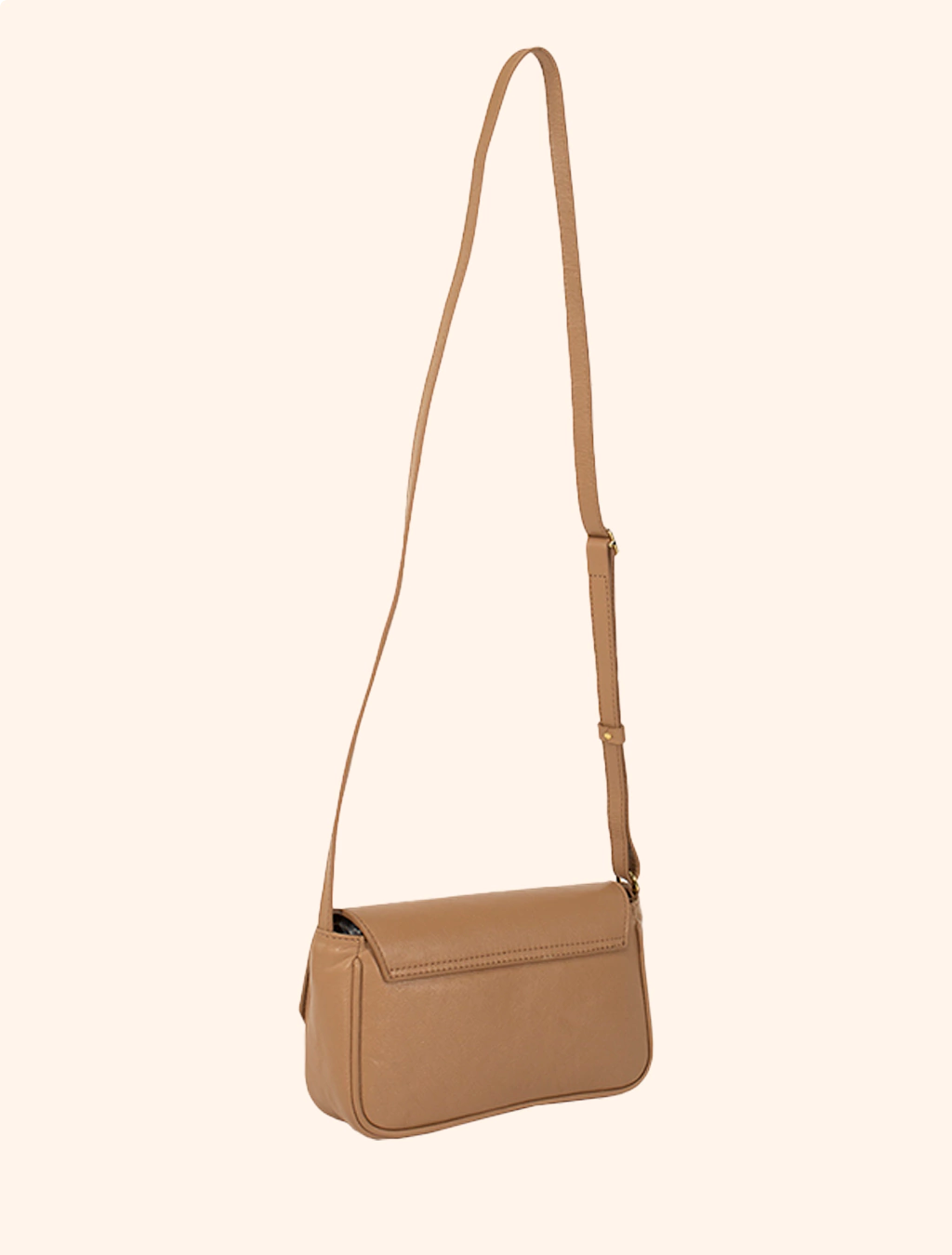 O couro macio deixa a peça naturalmente maleável, então ela acomoda mais do que o tamanho sugere, enquanto a cor tan garante versatilidade: combina com tons neutros, terrosos, coloridos e até looks mais formais. Um modelo atemporal com um refinamento discreto, marcado pela fivela frontal e o toque dourado da corrente.